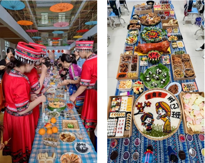 “長(zhǎng)桌宴”又稱(chēng)合攏宴,是侗族、苗族、瑤族等多個(gè)民族的風(fēng)俗習(xí)慣,常用于接親嫁女、滿月酒、村寨聯(lián)誼等宴飲活動(dòng),代表最為隆重的待客禮俗,已有幾千年歷史。“長(zhǎng)桌宴”上有壯族特色的五色糯米飯、艾葉糍粑、壯粽,苗族的傳統(tǒng)佳肴,還有黎族的三色飯……一份份美食造型美觀、色彩鮮艷、香味撲鼻。圖為集團(tuán)職工拍攝的孩子參加學(xué)?!叭氯被顒?dòng)。