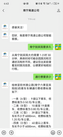 司乘只需關(guān)注“南寧高速公司”微信公眾號(hào),點(diǎn)擊發(fā)消息即可輕松開啟在線咨詢之旅。這種將AI智能客服融入微信公眾號(hào)的方式,充分考慮了司乘人員的使用習(xí)慣,進(jìn)一步拉近了企業(yè)與司乘之間的距離。